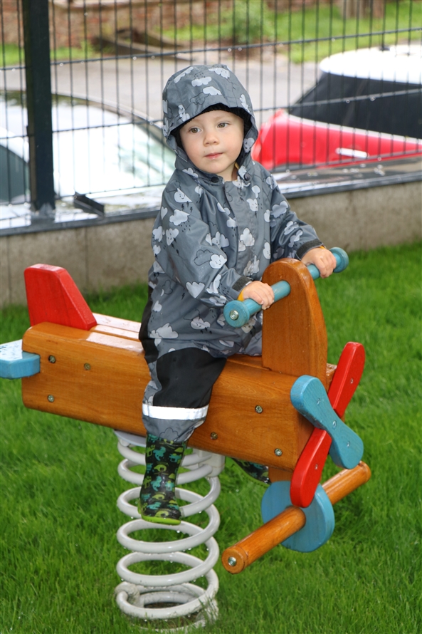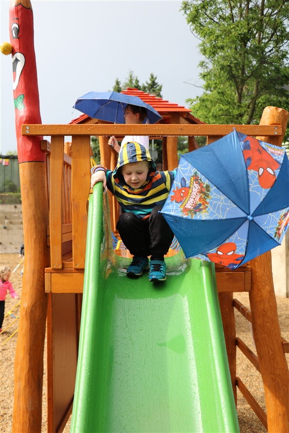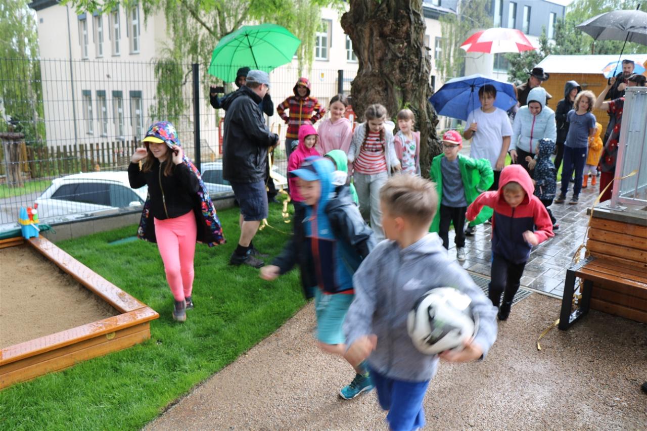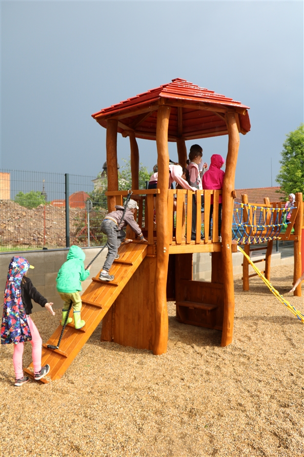 Počasí nám moc nepřálo, ale přesto se v neděli podařilo hřiště otevřít, děti si ho samy „rozbalily" jako dodatečný dáreček k sobotnímu dnu dětí. A pořádně rovnou vše prověřily – podívejte se, jak se do toho obuly.